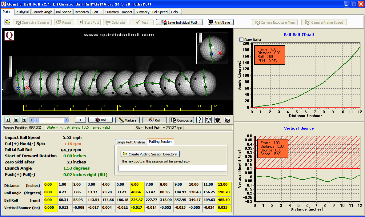 2つの計測データが、The Ball Roll Putting Analysis Software Demo Version 2.4(21日間無料)に入っていないため、このデモ版に含まれているデータの中から適当に選んだものを1つここに示します。